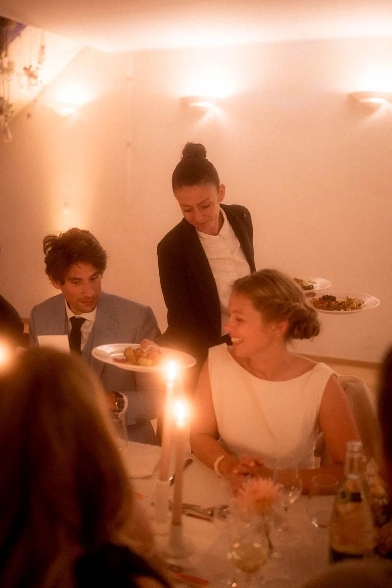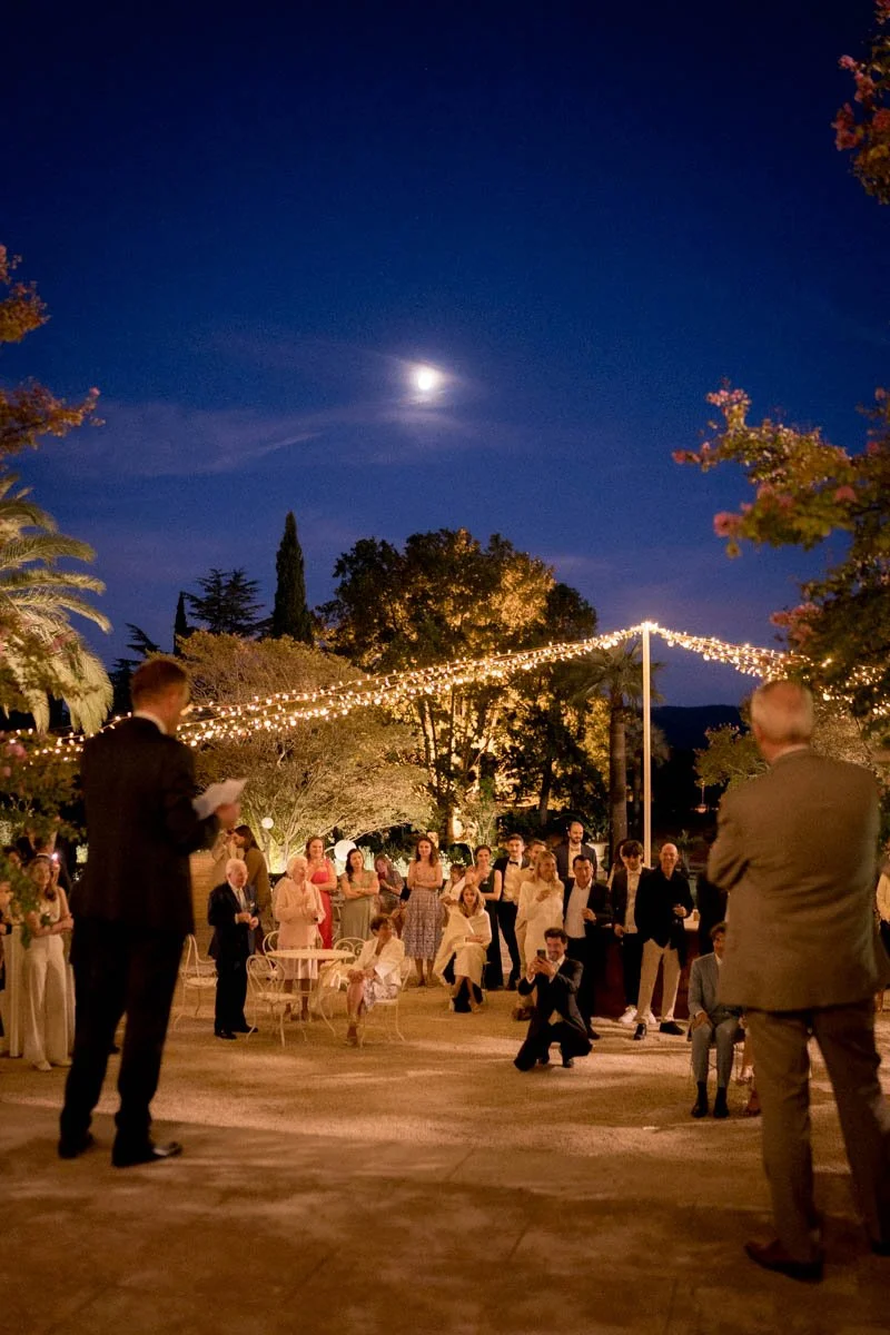 À la tombée du jour, les guirlande guinguette ont pris le relais. Suspendues dans la cour, elles ont donné à la soirée une atmosphère intime et presque magique. Le dîner s’est déroulé à l’intérieur par peur du froid, avec les discours, les rires et les moments de danse endiablés