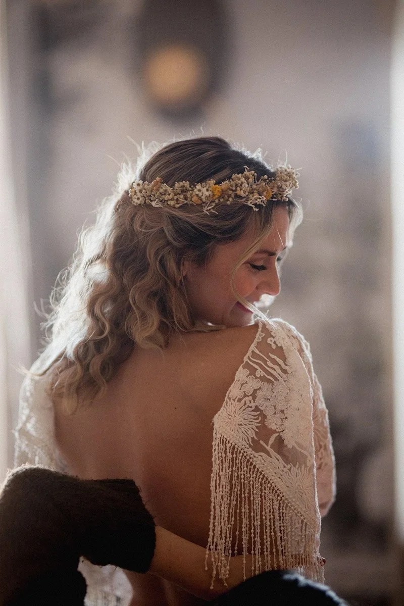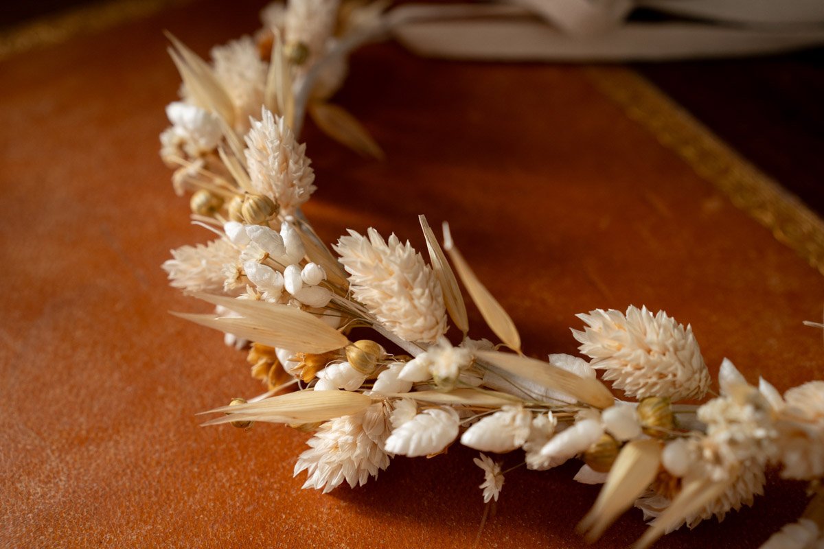 La couronne de fleurs séchées est devenue un incontournable pour les mariages au style nature et bohème. Elle apporte une note romantique et légère à la coiffure de la mariée. Chaque couronne que je réalise est unique : composée à la main, avec des teintes douces et harmonieuses que vous aurez choisi, elle s’accorde parfaitement à votre tenue et à l’ambiance de votre mariage. C’est l’accessoire de mariage idéal pour sublimer une coiffure, qu’elle soit lâchée, tressée ou relevée en chignon.