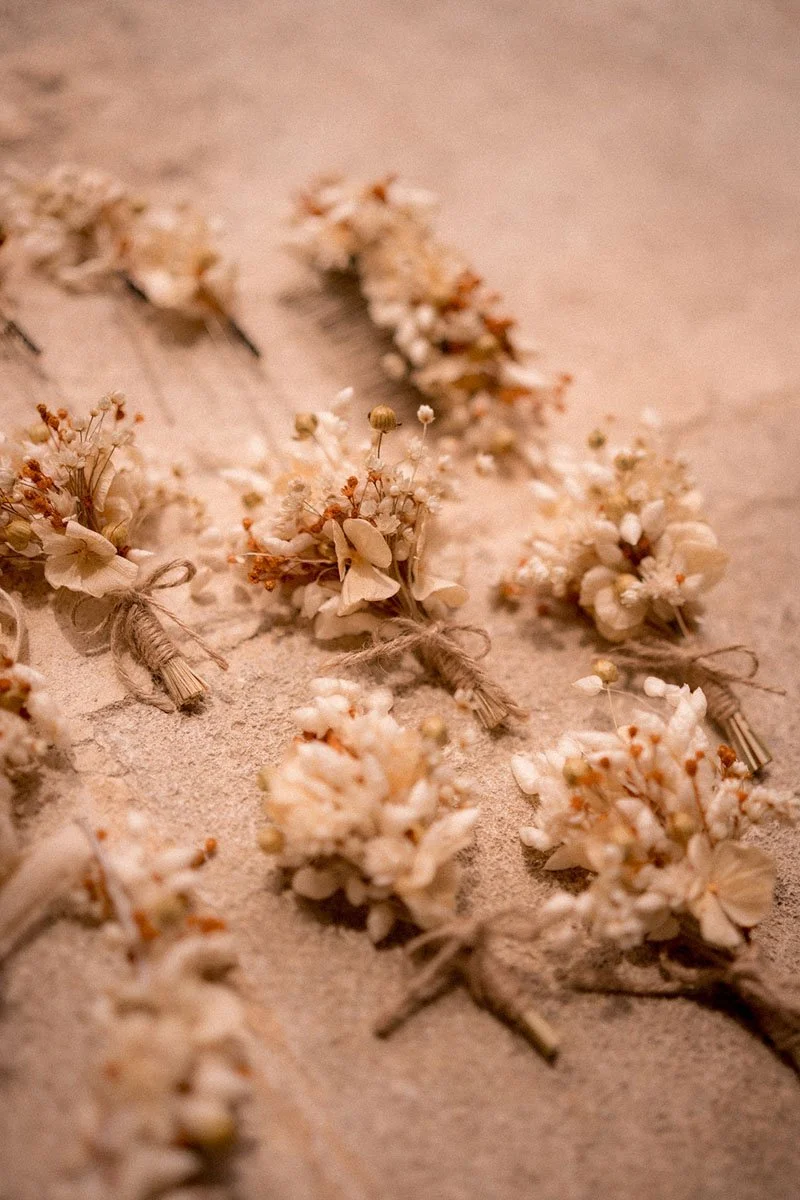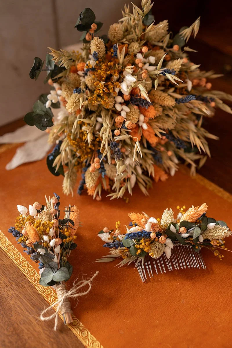 Accessoires de mariage en fleurs séchées : couronnes, boutonnières et peignes faits main