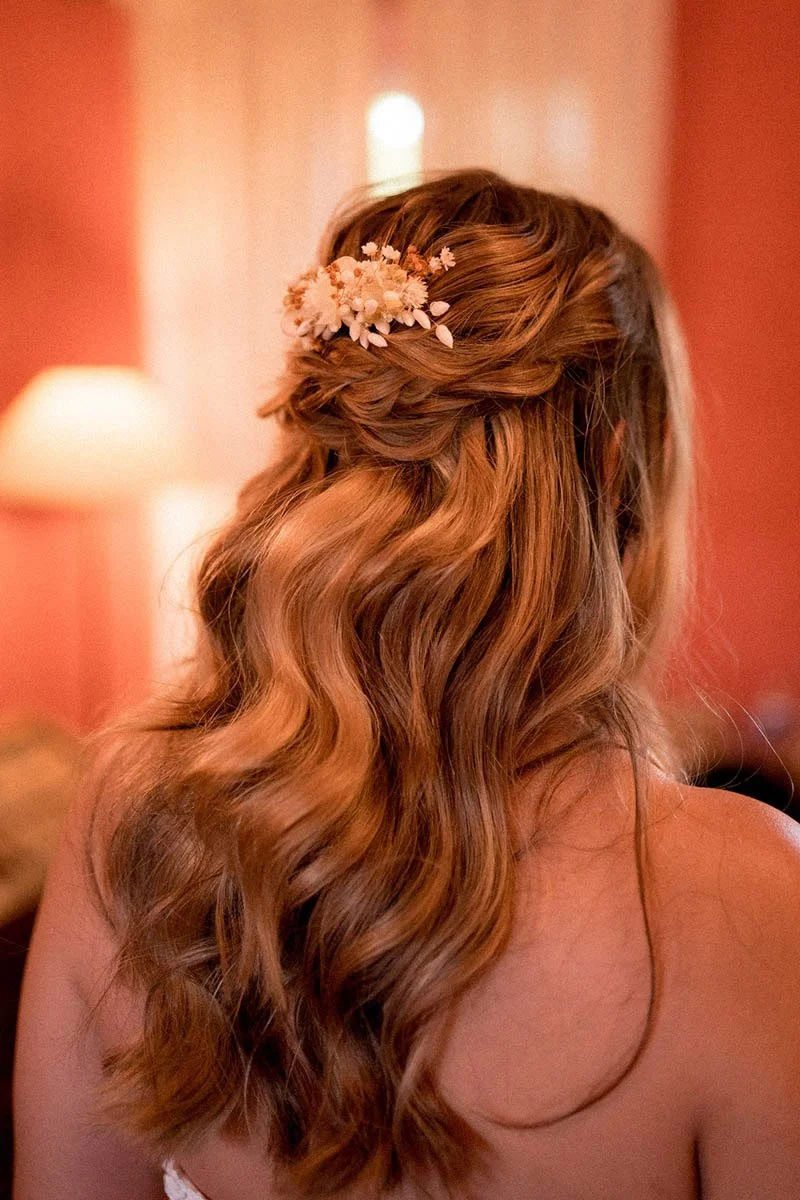Les peignes fleuris et les épingles en fleurs séchées sont parfaits pour celles qui recherchent une alternative subtile à la couronne. Placés plus discrètement dans un chignon, une tresse ou sur le côté, ils apportent une touche florale délicate et poétique. Ces accessoires de mariage personnalisés subliment votre coiffure tout en restant légers et faciles à porter.